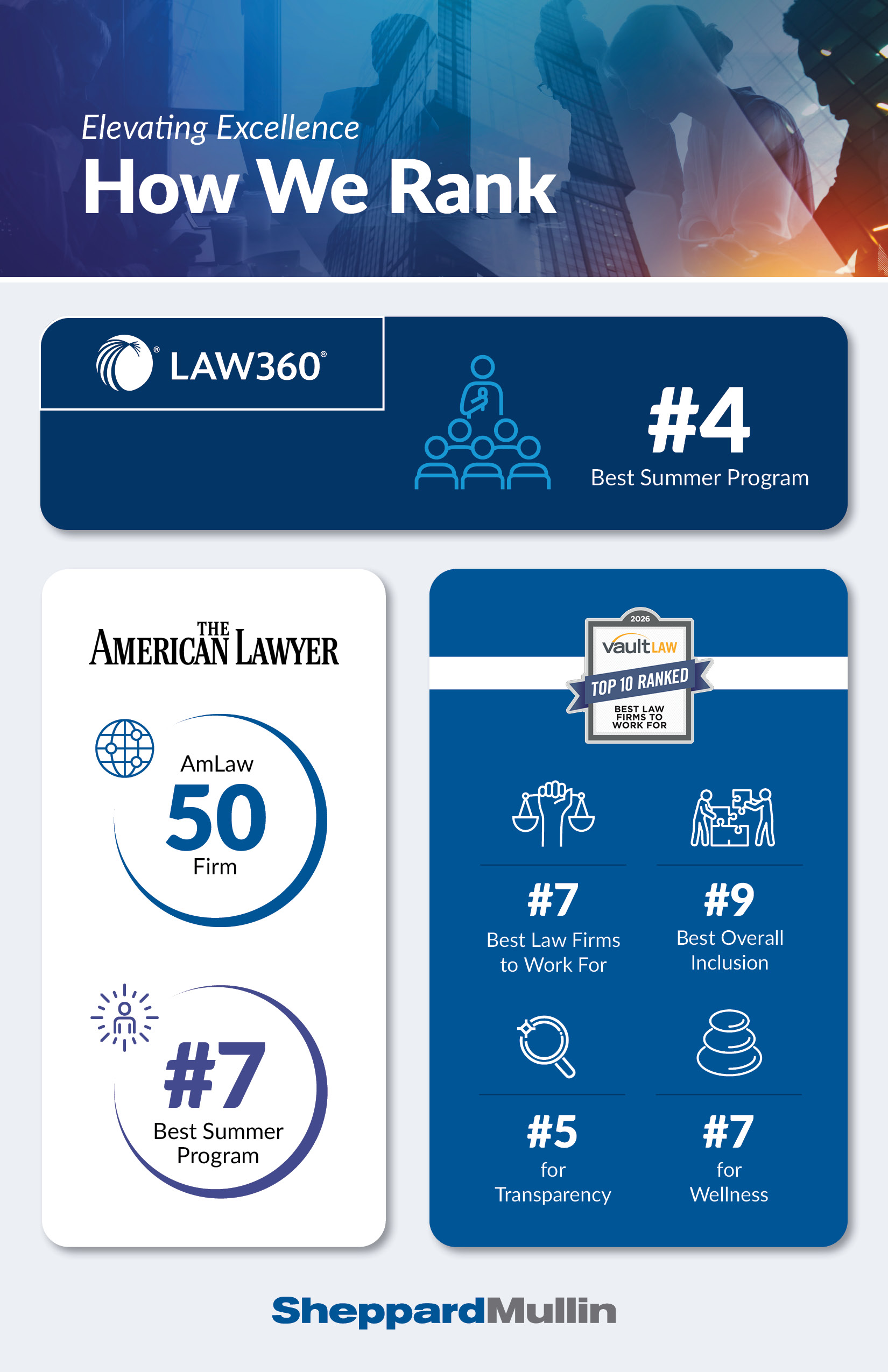 Sheppard Mullin's Summer Associate Program has consistently secured high rankings in national surveys, including Vault, Chambers Associate, Law 360 Pulse, and The American Lawyer.